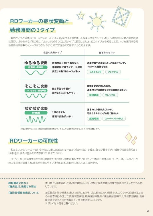 NPO法人両育わーるど(所在地:東京都渋谷区、理事長:重光喬之)が運営する 難病者の社会参加を考える研究会は、この度『難病者の社会参加白書2025~RDワーカーの可能性~』ダイジェスト版(B5判、12頁)を発行しました。
