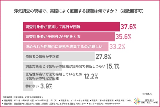 最後に、「浮気調査の現場で、実際によく直面する課題」について尋ねたところ、『調査対象者が警戒して尾行が困難(37.6%)』『調査対象者が予想外の行動をとる(35.6%)』『決められた期限内に証拠を収集するのが難しい(33.2%)』が上位になりました。