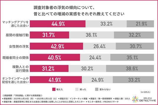 続いて、「調査対象者の浮気の傾向について、昔と比べての増減の実感」を項目別で尋ねたところ、出会い方や形態はオンライン化・多様化が進んでおり、「マッチングアプリ」や「オンラインゲーム・配信」を通じた出会いが増加傾向にあることが示されました。匿名性の高さや手軽さが、倫理的な抑制を弱めていると考えられます。