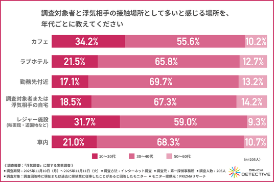 浮気相手との接触場所は、10~20代は人目のある場所が多く開放的な関係が多い一方、30~40代は現実的でリスクを抑えた場所が中心となっています。