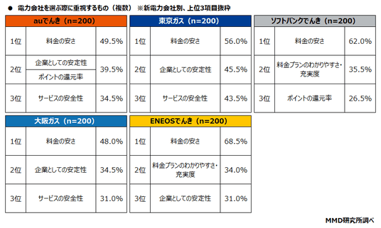■ 新電力会社利用者が電力会社を選ぶ際に重視するもの「料金の安さ」がいずれもトップ