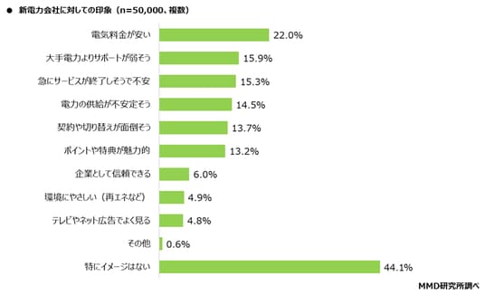 20歳~69歳の男女50,000人を対象に、新電力会社に対しての印象を聞いたところ(複数回答可)、「電気料金が安い」が22.0%と最も多く、次いで「大手電力よりサポートが弱そう」が15.9%、「急にサービスが終了しそうで不安」が15.3%となった。