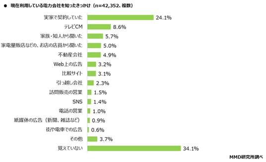 電力会社を契約していると答えた42,352人を対象に、現在利用している電力会社を知ったきっかけを聞いたところ(複数回答可)、「実家で契約していた」が24.1%と最も多く、次いで「テレビCM」が8.6%、「家族・知人から聞いた」が5.7%となった。