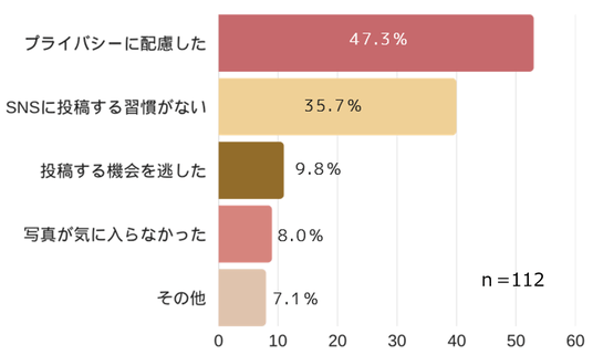 SNSに投稿しなかった理由として最も多かったのは「プライバシーに配慮したため」(47.3%)、次いで「投稿習慣がないため」(35.7%)でした。