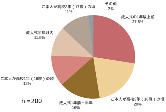 振袖の準備開始時期は「成人式の1年以上前」が27.5%で最多となり、高校3年生(18歳)での準備開始も20%と続きました。
