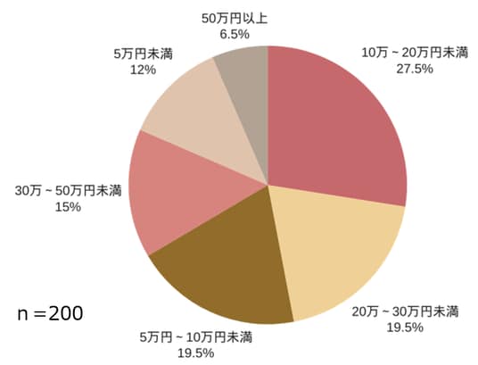 成人式関連費用は「10万~20万円未満」が27.5%で最多となり、「5万~10万円未満」「20万~30万円未満」がともに19.5%と続きました。
