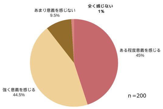 成人式写真をカタチで残すことに対し、「強く意義を感じる」44.5%、「ある程度意義を感じる」45%となり、合わせて89.5%が肯定的な評価でした。