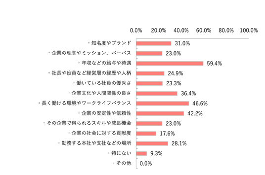 Q1の結果より、上位から順に、「年収などの給与や待遇(59.4%)」、「長く働ける環境やワークライフバランス(46.6%)」「企業の安定性や信頼性(42.2%)」となっており、転職によるスキル・年収UPが浸透している昨今においても、最初に就職する企業においては、長期雇用に関わる要素を重視していると考えられます。