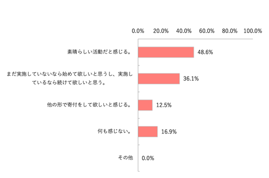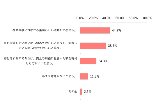 Q3の結果より、企業の寄付活動に関しては44.7%の学生が「社会貢献につながる素晴らしい活動だと感じる」、38.7%の学生が「まだ実施していないなら始めて欲しいと思うし、実施しているなら続けて欲しいと思う」と回答しているため、企業の寄付活動に対する関心度は非常に高いと言えます。