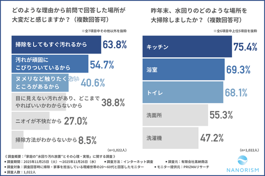 昨年末に大掃除をした場所として「キッチン」「浴室」「トイレ」が上位を占め、日常的に「掃除が大変」と感じている場所と重なっています。