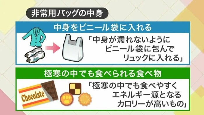 根本教授は、着替えや防寒着が濡れないようにするほか、熱を生み出すカロリー源として、極寒の中でも食べやすいようかんやチョコレートも避難時に持ち出すリュックに入れておくと良いとしている。