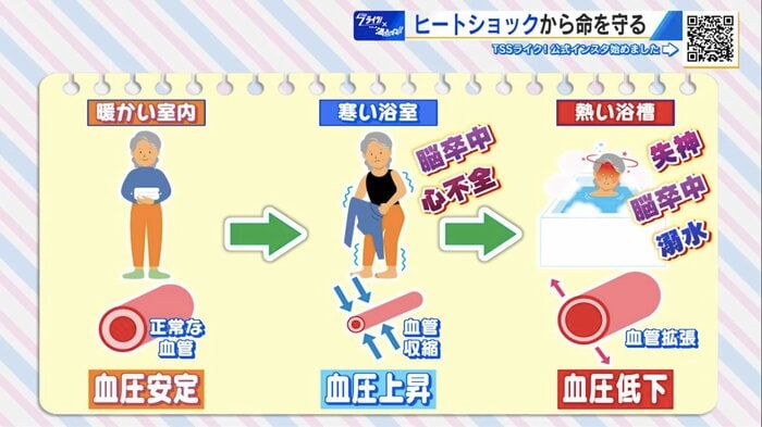 木村先生は「寒いところで血管が縮むと血圧がビューッと上がり、逆に熱い風呂に入ると血圧がストンと下がる。その落差が命を危険にさらす」と説明する。