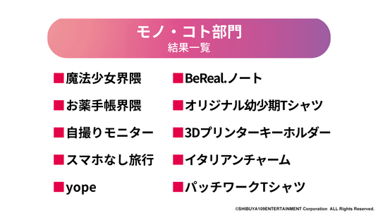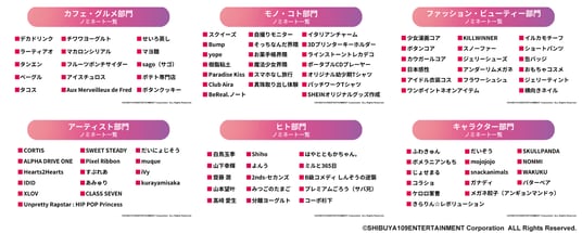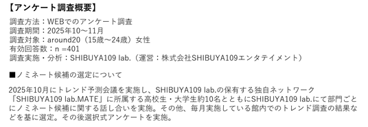 around20と実施した「トレンド予測会議」や毎月のSHIBUYA109渋谷店館内での調査の結果を基にノミネートを選定。その後選択式アンケートを実施して上位項目をピックアップしています。