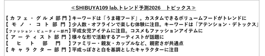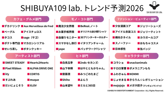 昨年発表した『SHIBUYA109 lab.トレンド予測2025』では、「ドバイチョコレート」「ぬい活」「耳つぼジュエリー・ボディジュエリー」「有線イヤホン」などを予測し、Z世代が選ぶ今年のトレンドランキング『SHIBUYA109 lab.トレンド大賞2025』でも多数ノミネートされました。今年の『SHIBUYA109 lab.トレンド予測2026』では、キャラクター部門を新設した下記6部門でトレンドを予測します。