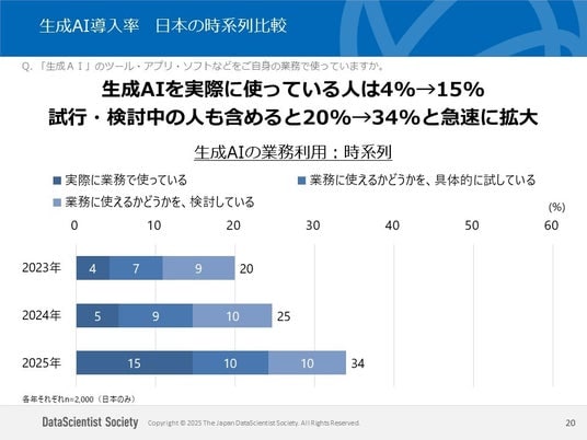 ・日本での生成AIの業務利用は、検討中を含めると2023年の20%から、2025年は34%に拡大。