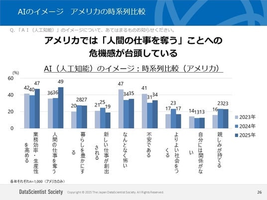 ・一方で、アメリカでは「人間の仕事を奪う」が36%から49%と急増しており、職を奪われることへの懸念が高まっている。