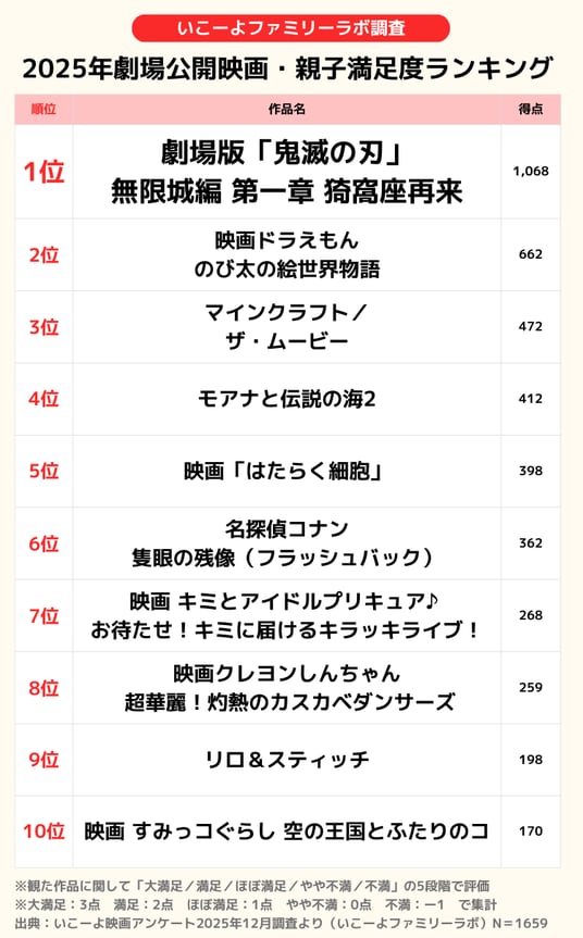 国内最大級の子供とお出かけ情報サイト「いこーよ」を運営するアクトインディ株式会社(東京都品川区 代表取締役:下元敬道 以下、アクトインディ)では、アンケート調査や取材からリアルな親子の行動を浮き彫りにする「いこーよファミリーラボ」にて、「2025年劇場公開映画・親子満足度ランキング」を発表いたします。