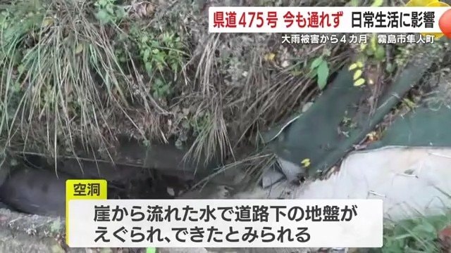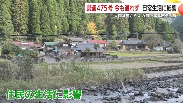 2025年8月に鹿児島県霧島市や姶良市を中心に発生した大雨から4カ月が経過した。姶良市の国道にかかる網掛橋など通行止めが解消された箇所もある一方、いまだに復旧の見通しが立たない道路も存在する。その一つが霧島市隼人町松永地区の県道475号だ。地元住民の日常生活に影響が出ている現状を取材した。
