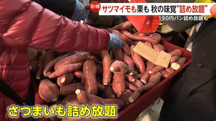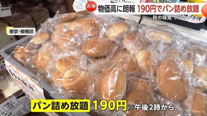 東京・池袋の百貨店で9日から始まった「芋・栗・あんこフェス」で、初めてブランドさつまいもの詰め放題が企画された。一方、物価高が続く中で、板橋区の店では、形の悪いパンや作りすぎたパンを税込み190円で詰め放題にしており、客は家計の助けになると喜んで購入している。