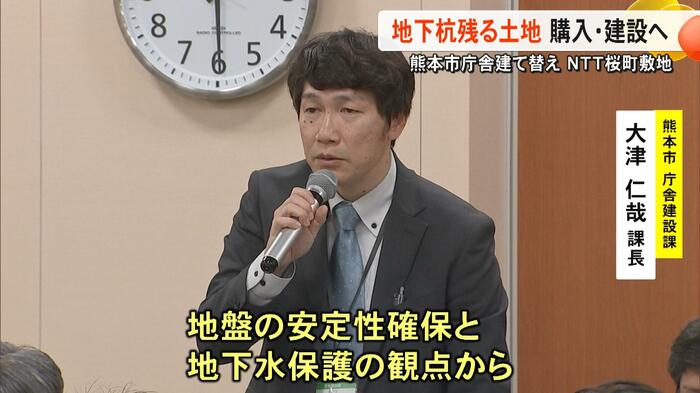 熊本市庁舎建設課の大津仁哉課長は「地盤の安定性の確保と地下水の保護の観点から、杭を残して引き渡しを受け、杭を残した状態で新庁舎の工事を行いたいと考える」と述べた。