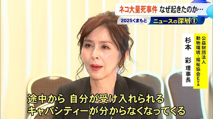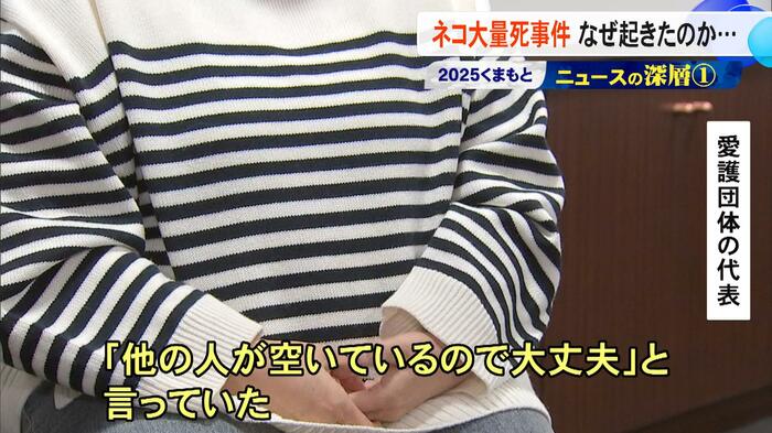事件はなぜ起きたのか、女が所属していた団体の代表に話を聞いた。愛護団体の代表は「ネコの保護依頼があったら『こういう依頼があるけど、大丈夫?いっぱいいるんじゃない?』と必ず聞いていたが、『他の人が空いているので大丈夫です』と言っていた。『今、何匹しかいない』と結構少ない数を言っていた」と振り返る。