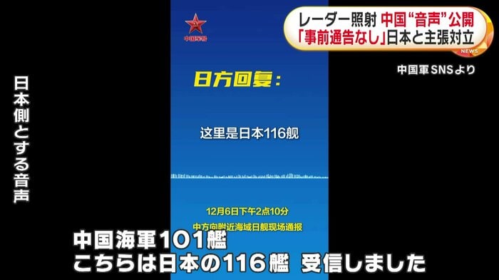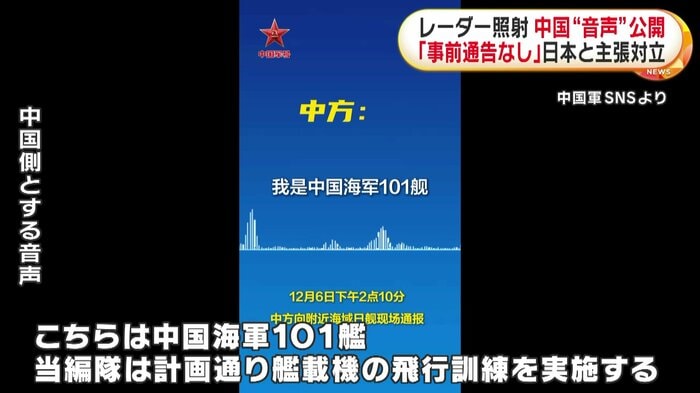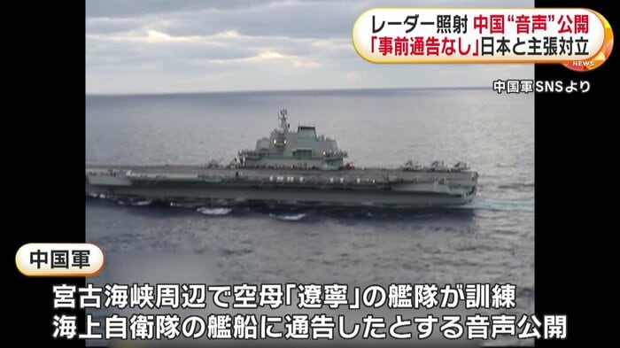 自衛隊機へのレーダー照射をめぐり、中国軍は9日、SNSで宮古海峡周辺での空母「遼寧」の艦隊による訓練について、近くにいた海上自衛隊の艦船に事前に通告したとする音声データを公開した。