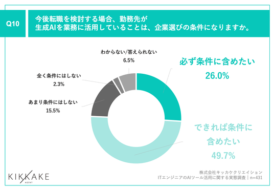 「Q10.今後転職を検討する場合、勤務先が生成AIを業務に活用していることは、企業選びの条件になりますか。」(n=431)と質問したところ、「必ず条件に含めたい」が26.0%、「できれば条件に含めたい」が49.7%という回答となりました。
