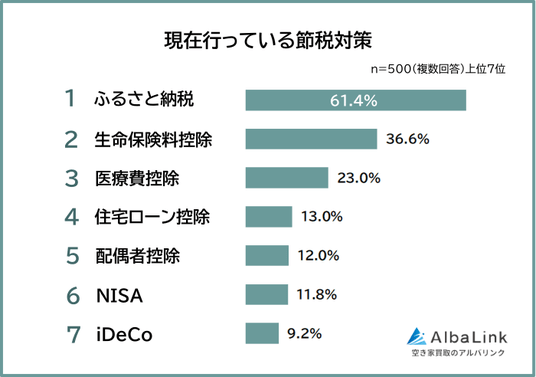 「現在行っている節税対策」の圧倒的1位は「ふるさと納税(61.4%)」で、なんと60%以上が実施していました。2位「生命保険料控除(36.6%)」と答えた人も多くなりました。3位「医療費控除(23.0%)」、4位「住宅ローン控除(13.0%)」、5位「配偶者控除(12.0%)」が続きます。