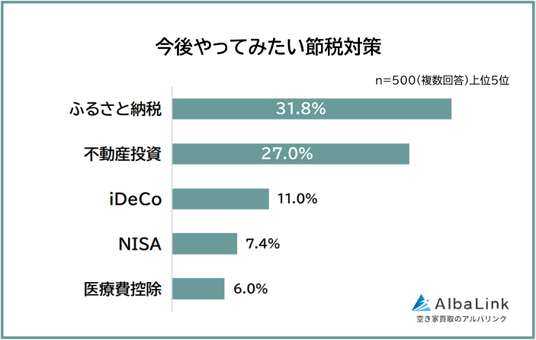 続いて「今後やってみたい節税対策」を聞いたところ、1位は現在実践している節税方法と同じ「ふるさと納税(31.8%)」でした。2位「不動産投資(27.0%)」と答えた人も30%近くと、多くなっています。