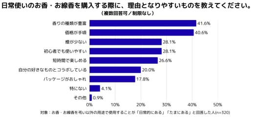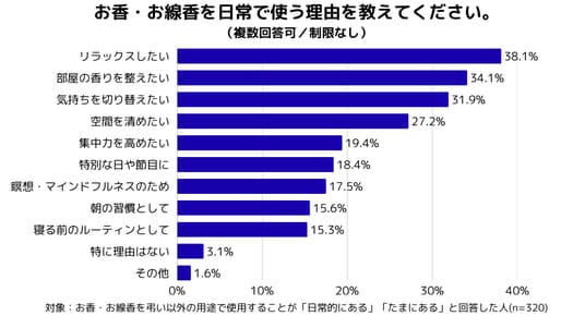 使用理由としては、「リラックスしたい」(38.1%)が最も多く、次いで「部屋の香りを整えたい」(34.1%)、「気持ちを切り替えたい」(31.9%)となり、お香・お線香が日常生活における心のケアツールとして活用されていることがわかりました。