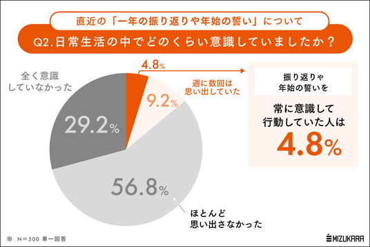 調査の結果、日本人の16.8%しか年末年始の振り返りや誓いを活かせておらず、86%は日常生活に戻ったら思い出すこともなくなっていることが判明。行動を変える深い内省には3カ月程度かかることも示唆された
