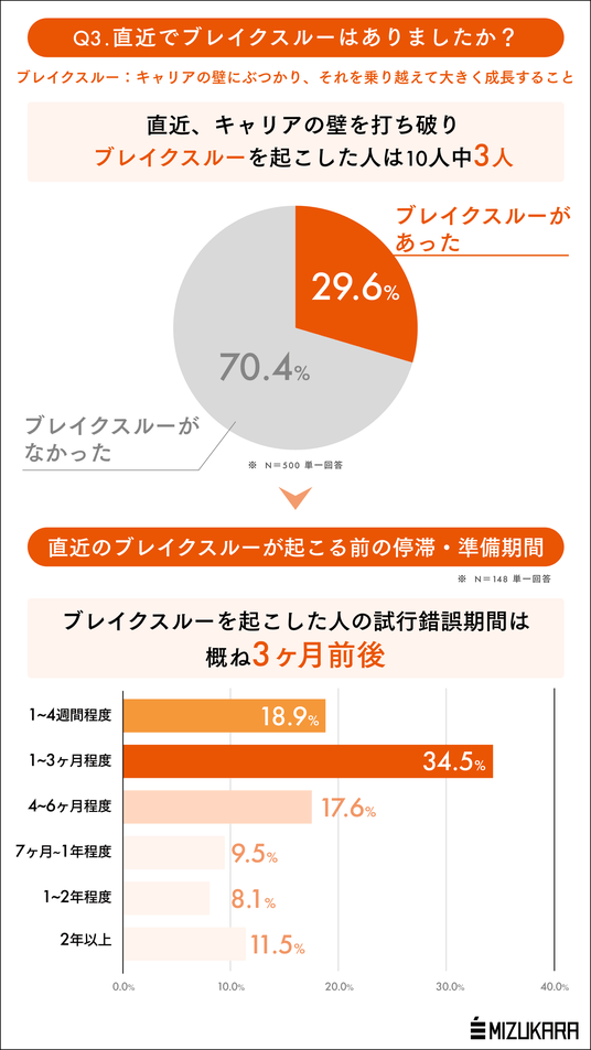 そもそも1週間程度の年末年始で、充分な反省や価値観の更新はできるのでしょうか?そこで参考までにキャリアの「壁」にぶつかった時に、それを打ち破る試行錯誤にどれくらいの時間が必要なのかも調査してみました。まず直近でキャリアの「壁」を打ち破った人は10人に3人程度存在することがわかりました。