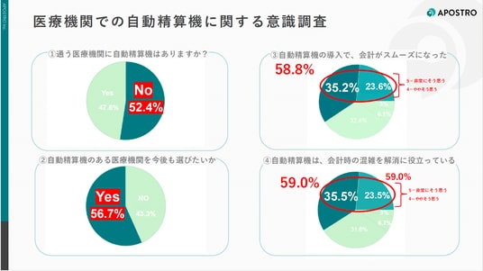 - 「混雑解消に役立っている」:59.0%と、利用者の多くが肯定的な印象を持っていることが明らかになりました。また、「自動精算機がある医療機関には好印象」と回答した人は46.8%でした。