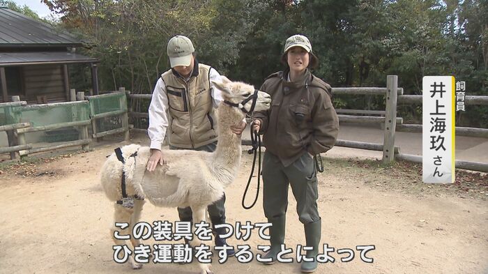 飼育員の井上海玖さんは「この装具を付けて“ひき運動(散歩)”をすることで、正しい位置で膝を固定した状態で、筋肉を膝の周りに付けるという目的です」と話す。