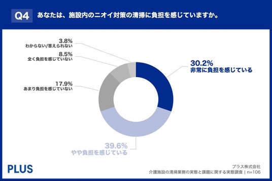 「Q4. あなたは、施設内のニオイ対策の清掃に負担を感じていますか。」(n=106)と質問したところ、「非常に負担を感じている」が30.2%、「やや負担を感じている」が39.6%という回答となりました。