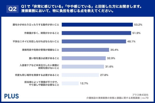 「Q2. Q1で「非常に感じている」「やや感じている」と回答した方にお聞きします。清掃業務において、特に負担を感じる点を教えてください。(複数回答)」(n=79)と質問したところ、「腰をかがめたり立ったりする動作が多いこと」が53.2%、「作業量が多く、時間がかかること」が51.9%、「不快なニオイに対応しなければならないこと」が48.1%という回答となりました。