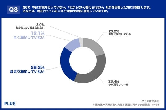 「Q8. Q6で「特に対策を行っていない」「わからない/答えられない」以外を回答した方にお聞きします。あなたは、現在行っているニオイ対策の効果に満足していますか。」(n=99)と質問したところ、「非常に満足している」が20.2%、「やや満足している」が36.4%という回答となりました。