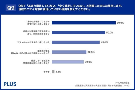 「Q9. Q8で「あまり満足していない」「全く満足していない」と回答した方にお聞きします。現在のニオイ対策に満足していない理由を教えてください。(複数回答)」(n=40)と質問したところ、「ニオイの元を断つことができていないと感じるから」が60.0%、「何度も対策を繰り返す必要があり、時間がかかるから」が50.0%、「コストがかかりすぎると感じるから」が45.0%という回答となりました。