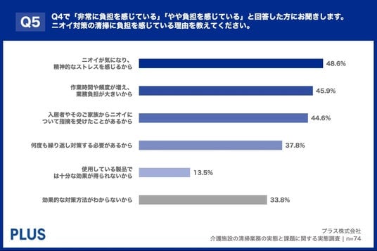 「Q5. Q4で「非常に負担を感じている」「やや負担を感じている」と回答した方にお聞きします。ニオイ対策の清掃に負担を感じている理由を教えてください。(複数回答)」(n=74)と質問したところ、「ニオイが気になり、精神的なストレスを感じるから」が48.6%、「作業時間や頻度が増え、業務負担が大きいから」が45.9%、「入居者やそのご家族からニオイについて指摘を受けたことがあるから」が44.6%という回答となりました。