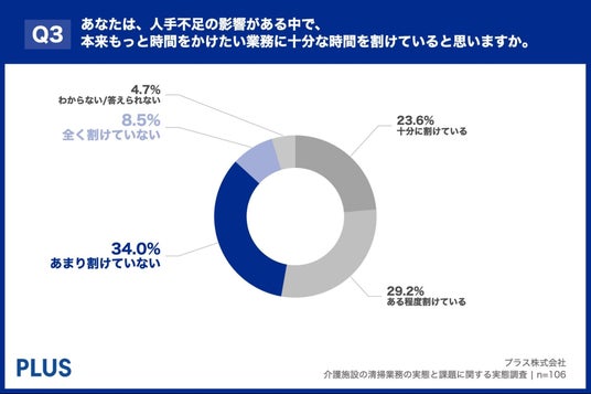 「Q3. あなたは、人手不足の影響がある中で、本来もっと時間をかけたい業務(入居者とのコミュニケーションやケア等)に十分な時間を割けていると思いますか。」(n=106)と質問したところ、「十分に割けている」が23.6%、「ある程度割けている」が29.2%という回答となりました。