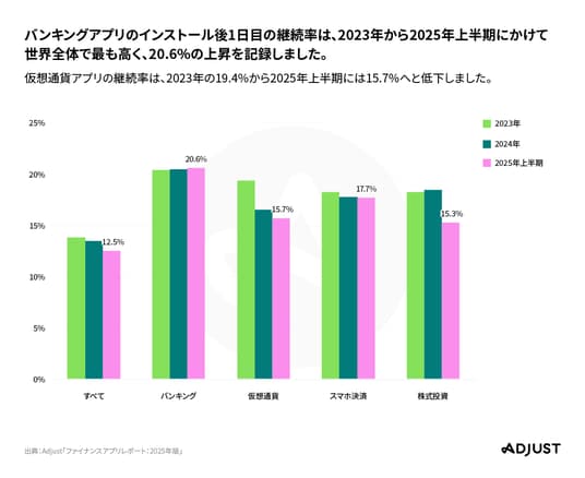 「2025年のファイナンスアプリ市場は、急速な拡大から持続可能な成長へと移行しています。その中でも日本は、ファイナンスアプリの1日目継続率が18.6%と世界トップ水準を記録し、特にバンキングアプリでは20.6%という高いロイヤリティが見られます。ユーザーが日常の金融行動をデジタルで安心して行える環境が整い、アプリ体験そのものへの期待がますます高まっていることがうかがえます。