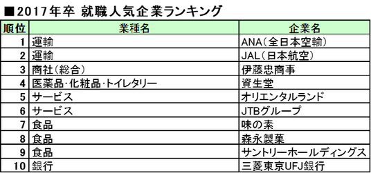 10年前の2017年卒はANA(全日本空輸)とJAL(日本航空)の航空2社がトップ2を占め、翌年も同じ順位。ANAは2016~19年の4年連続1位でした。コロナ禍の直撃を受け2021年卒から新卒採用を中止した両社ですが、採用再開後、インバウンド(外国人旅行客)の活況もあって人気も復活し、2027年卒ではANAが14位、JALも26位に上がってきました。