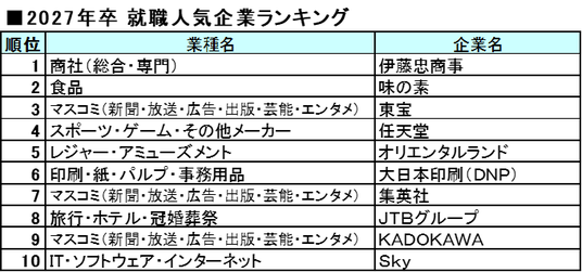 ▽「2027年卒就職人気企業ランキング」の詳細は以下URLよりご覧ください。