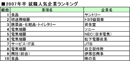 20年前、2007年卒の「就職人気企業ランキング」トップはサントリーで、前後も含めると2006~08年に3年続けて1位でした。次いで2位のトヨタ自動車は2003~07年卒に5年連続、3位の資生堂は2006~12年に7年連続、7位JTBは2002~07年に6年連続でトップ10入りする人気ぶり。資生堂は2009~10年は1位でした。業種で目立つのは「電気機器」。ソニーに加え、NEC(日本電気)、松下電器産業、日立製作所の4社がトップ10に並びました。10社のうち8社をメーカーが占め、当時の日本の産業構造の特徴を反映した結果でした。9位の伊藤忠商事は、この年を皮切りに2027年卒まで21年連続でトップ10入りを続けています。