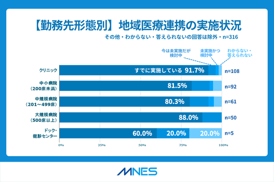 地域医療連携の実施状況は、クリニックが「すでに実施している」の回答が最も高く91.7%・中規模病院では実施割合が一番低い80.3%