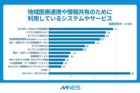 地域医療連携や情報連携のために利用しているシステムやサービスは「わからない・答えられない」が最多回答29.9%となり、現場レベルでシステム運用を十分に把握できていないケースが目立つ結果に。次いでCD-ROMやUSBなどのアナログ媒体の利用が23.6%