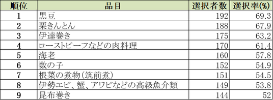 黒豆、栗きんとん、伊達巻きが最も支持され、伝統的な甘味系が高い人気を示し、続いてローストビーフ、海老、数の子など肉と魚介が続きました。
