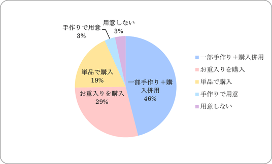 「一部手作り+購入併用」が46%で最多。家庭の味とプロの品質を両立させる“ハイブリッド志向”がうかがえました。また、全て手作りで準備すると回答したのは3%でした。