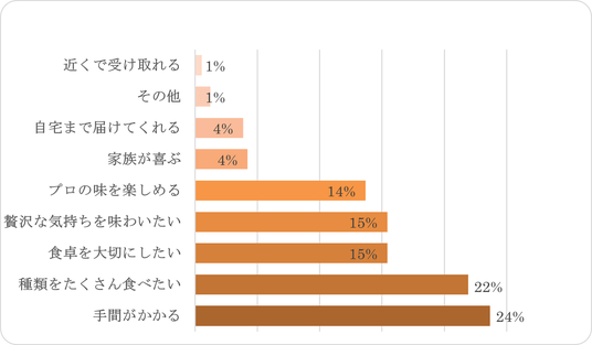 おせち購入の理由として「手間がかかる」(24%)「種類をたくさん食べたい」(22%)「贅沢な気持ちを味わいたい」(15%)「プロの味を楽しみたい」(14%)などが上位にあがりました。