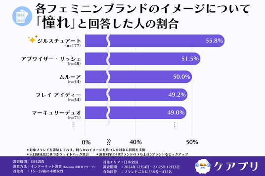 「憧れ」のイメージを持つ人の割合は『ジルスチュアート』が55.8%で最も高く、『アプワイザー・リッシェ(Apuweiser-riche)』が51.5%、『ムルーア(MURUA)』が50.0%と続いています。また、『フレイ アイディー(FRAY I.D)』が49.2%、『マーキュリーデュオ(MERCURYDUO)』が49.0%となりました。